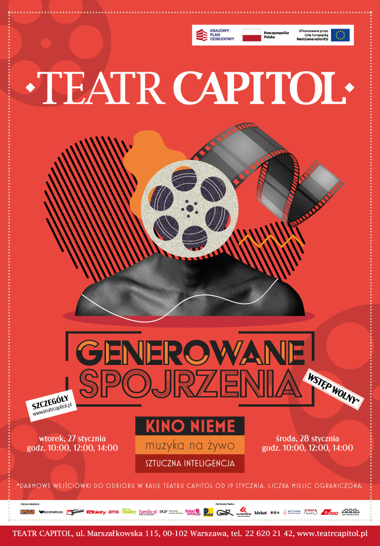 „Generowane spojrzenia” to projekt, w którym muzyka improwizowana staje się impulsem dla sztucznej inteligencji. Algorytmy AI reagują na dźwięk, tworząc dynamiczne projekcje wizualne, towarzyszące klasycznym filmom kina niemego. Każdy pokaz kończy się otwartym spotkaniem edukacyjnym: rozmową oraz krótkimi warsztatami. Podczas nich uczestnicy w przystępny sposób poznają zasady działania sztucznej inteligencji oraz jej praktyczne zastosowania w sztuce i codziennym życiu. To przestrzeń do zadawania pytań, wymiany doświadczeń i wspólnego odkrywania nowych technologii – niezależnie od poziomu wcześniejszej wiedzy.